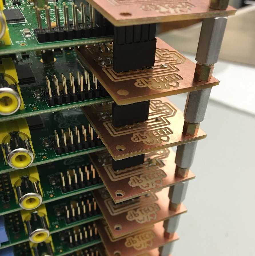 Multiple node cluster built out of 32 Raspberry PI B+. Networked together using a standard network switch. Bootstrapped a custom power supply